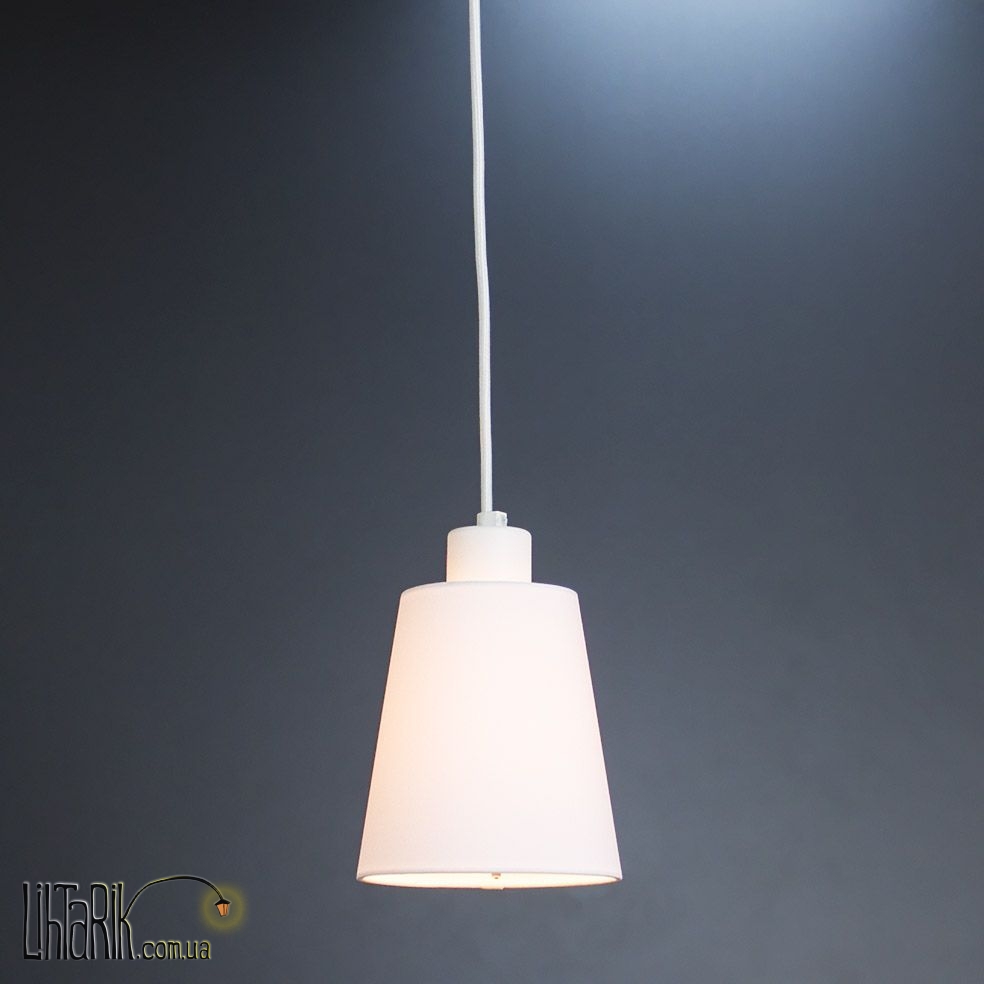 Подвесной светильник с оригинальным абажуром, конусообразной формы впишется в любую дизайнерскую среду. Подходит для вашей кухни. Модель представлена в белых тонах. Светильник изготовлен из металла, ткани высокого качества