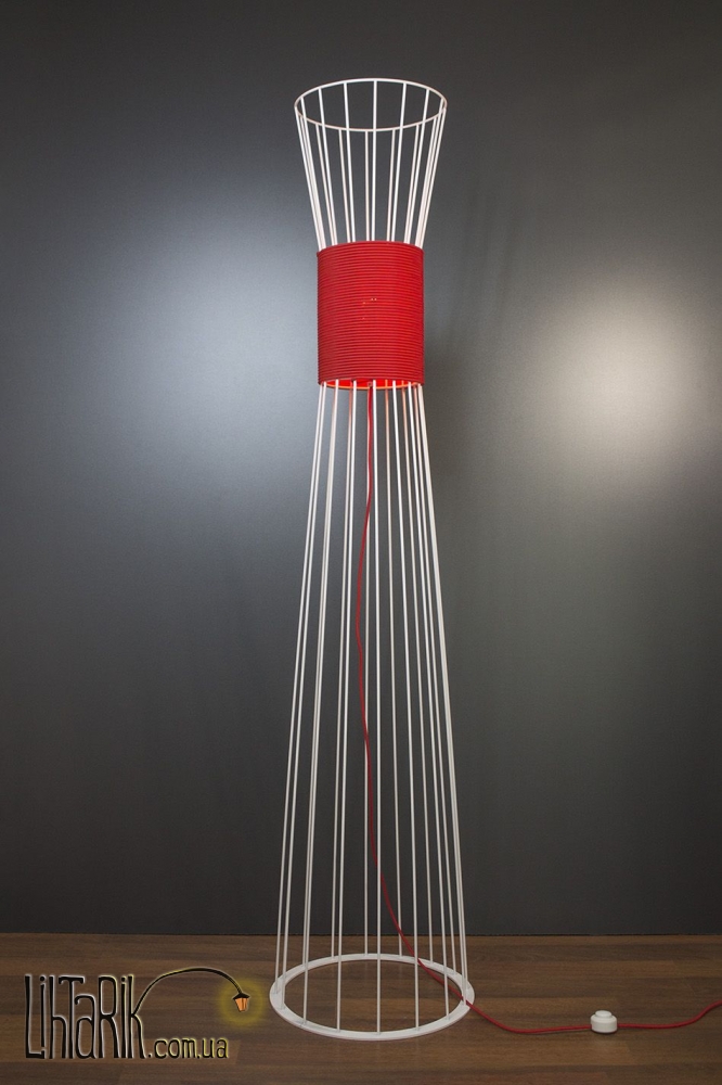 Оригинальный торшер колбовидной формы впишется в любую дизайнерскую среду. Подходит для вашей гостиной, прихожей, спальни. Модель представлена в белых, красных тонах. Светильник изготовлен из металла, ткани высокого качества
