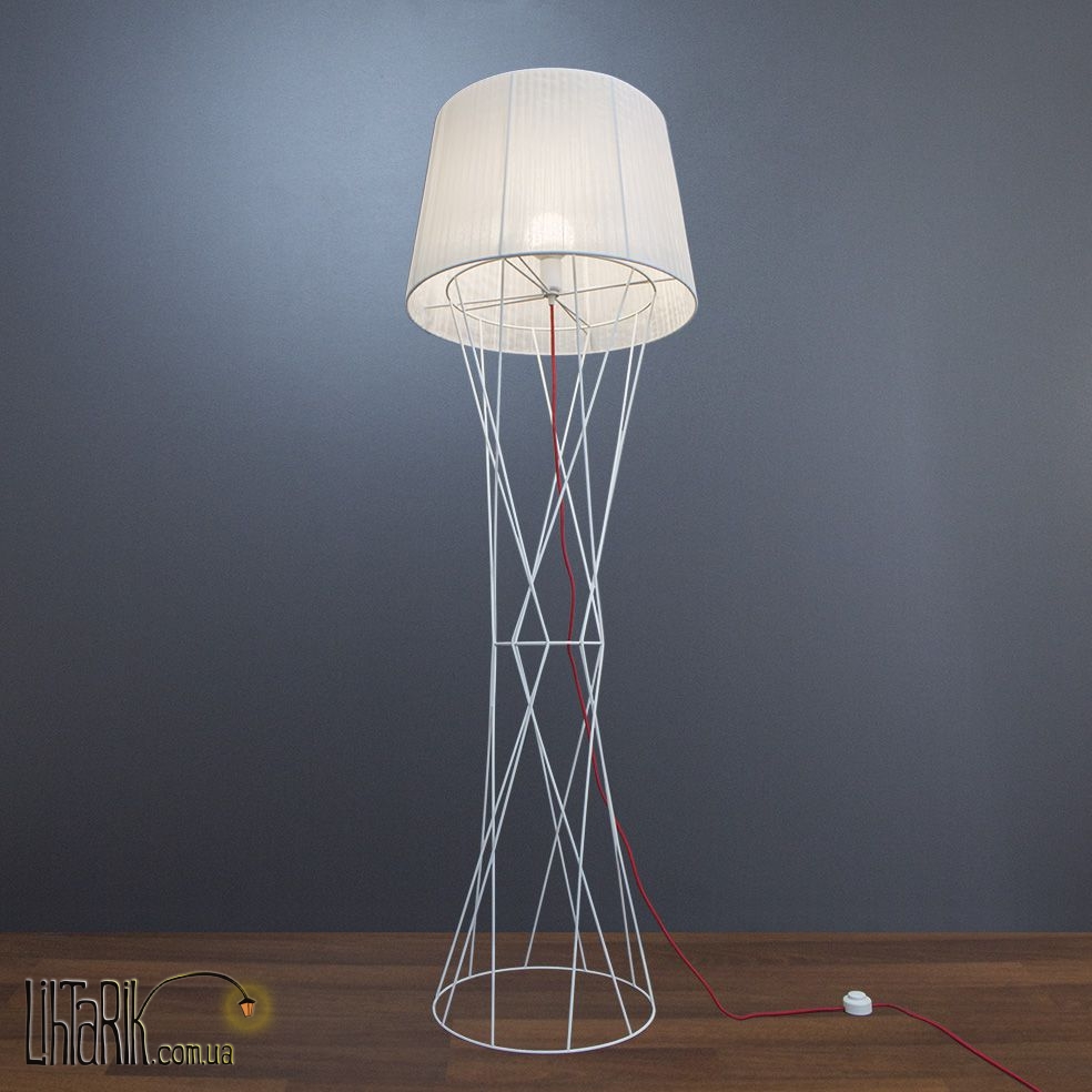 Оригинальный торшер с оригинальным абажуром впишется в любую дизайнерскую среду. Подходит для вашей гостиной, прихожей, спальни. Модель представлена в белых, красных тонах. Светильник изготовлен из металла, ткани высокого качества