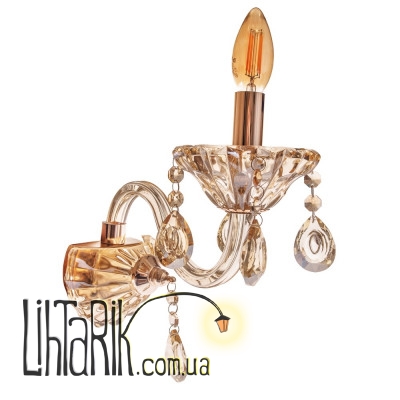 Классическое бра, наполненное духом былых эпох, поведает вам о тайнах прошлого и выигрышно подчеркнет дизайн интерьера спальни, гостиной или прихожей в вашей городской квартире или загородном доме. Бра изготовлено из металла и стекла. Его конструкция состоит из полукруглого стеклянного основания, к которому с помощью фигурного держателя прикреплен патрон для лампы, помещенный в стеклянную тарелочку. Внешне конструкция данного светильника напоминает старинный канделябр, вот только вместо восковой свечи источником света служит одна электрическая лампочка с цоколем Е14 мощностью 40 Вт. Светильник может похвастаться богатым дизайном. Украшен он стеклянными подвесками с гранеными камушками цвета шампань. Данное бра сделает атмосферу в доме уютной, праздничной. Так, что приглашайте гостей и устраивайте душевное чаепитие.