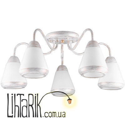 Потолочная люстра BKL-579S/5 E27 монтируется непосредственно к потолку с помощью, закрепленной на основании, планки. Ее компактная конструкция не займет жилой объем помещения, не утяжелит его внешний вид, хорошо подойдет для небольшой гостиной или спальни с невысоким потолком. Люстра изготовлена из металла и стекла. Конструкция представлена небольшим металлическим каркасом белого цвета с вкраплениями золотистого, к которому прикреплено пять плафонов. Плафоны стеклянные, белые, матовые. Приглушают, излучаемый лампами свет, придавая ему мягкости. Для работы необходимо использовать пять ламп с цоколем Е27 мощностью 60 Вт. Рассчитана люстра для работы от сети 220 В. Включать и выключать ее нужно с помощью настенного клавишного выключателя.