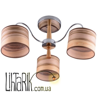 Идеальный вариант для освещения небольшой уютной кухни с невысоким потолком – люстра BKL-638S/3 E14. Потолочная модель подойдет и для загородного дома, ибо выполнена с использованием шпона – тонкого слоя древесины с текстурным рисунком (хвойных или лиственных пород). Шпон отличается экологичностью, долговечностью, устойчивостью к влажности. Для загородной кухни в самый раз. Конструкция представлена металлическим хромированным каркасом, к которому прикреплено три плафона из шпона. Они выполнены в форме цилиндра, приглушают излучаемый лампами свет, придавая ему мягкость. Для работы необходимо использовать три лампы с цоколем Е14 мощностью 40 Вт. Это могут быть как лампы накаливания, так и энергосберегающие или светодиодные. Рассчитан светильник для работы от сети 220 В. Тип крепления – монтажная планка. Дополнительная информация: Диаметр плафона – 150 мм Высота плафона – 120 мм