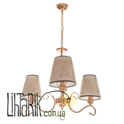 Люстра с абажуром BKL-652S/3 E27 FG в зависимости от стиля интерьера может сделать комнату более уютной или более стильной и интересной. Она будет хорошо смотреться как в классическом, так и в современном стиле. К металлическому каркасу золотистого цвета прикреплено три плафона-абажура коричневого цвета. Благодаря конструкции, свет от ламп приглушается и направленно рассеивается от абажуров. Тканевые абажуры имеют свойство частично поглощать свет, создавая спокойную, интимную атмосферу. Высоту можно изменять, путем удаления или добавления звеньев цепи. Для работы необходимо использовать три лампочки с цоколем Е27 (накаливания, энергосберегающая, светодиодная).