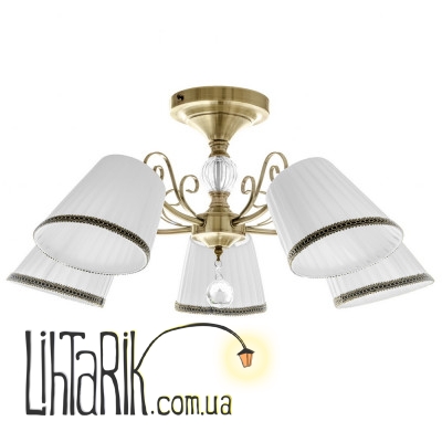 Люстра с абажурами BKL-716S/5 E14 AB обладает особой способностью привлекать к себе внимание. А все из-за плафонов-абажуров, которые приглушают, излучаемый лампами свет, придавая ему мягкости, а помещению романтической атмосферы. Конструкция осветительного прибора представлена металлическим каркасом цвета старое золото, к которому прикреплено пять плафонов. Они изготовлены из ткани, белого цвета. Каркас небольшой, с завитками, декорирован подвеской со стеклянным прозрачным граненым камушком. Для работы нужны пять ламп с цоколем Е14 (накаливания, энергосберегающая, светодиодная). Тип крепления – монтажная планка. Хорошо будет смотреться в гостиной или спальне.