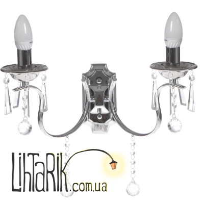 BR-01 313W/2 – бра, выполненное в классическом стиле. Его дизайн имитирует канделябр. Конструкция представлена металлическим хромированным каркасом, плафоны отсутствуют. Дополнительно каркас украшен подвесками со стеклянными гранеными камушками. Для работы необходимо использовать две лампочки с цоколем Е14 (накаливания, энергосберегающая, светодиодная). Рекомендуем отдать предпочтение лампам свечевидной формы. С ними светильник будет выглядеть гармонично. Включать и выключать светильник необходимо с помощью настенного клавишного выключателя.
