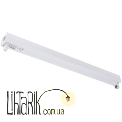 Накладной светильник на одну люминесцентную линейную лампу. Его корпус изготовлен из литого алюминия и окрашен в белый цвет. Это совершенно обычный, очень простой, проверенный временем, удобный и практичный дизайн светильника. Такие светильники используются для освещения торговых залов, офисов, складов, подсобных помещений и так далее. Свет люминесцентных ламп менее ярок, чем свет обычных ламп накаливания, но большая площадь излучающей поверхности компенсирует их светосилу. Свет люминесцентных ламп похож на дневной и позволяет так же хорошо различать цвета. При работе температура таких ламп не повышается. Также несомненным их преимуществом является широкий выбор оттенков лампы, которые зависят от люминофоров, которые были в ней использованы. Оттенки колеблются от холодных голубовато-белых до жёлтых. Люминесцентные лампы позволяют экономить электроэнергию, ведь по сравнению с аналогичными лампами накаливания они потребляют её в 4-5 раз меньше. Срок службы люминесцентных линейных ламп составляет до 18 000 часов.