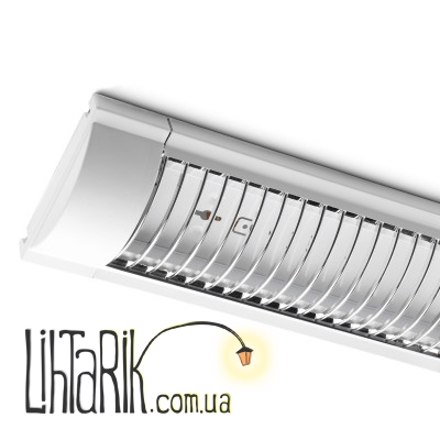 Длинный люминесцентный накладной светильник. Он рассчитан на две люминесцентные линейные лампы. Его корпус изготовлен из литого алюминия, а решётка, защищающая лампы от случайных повреждений – из пластика, окрашенного под цвет металла. Такие светильники обычно монтируют на стену или потолок. Люминесцентные светильники чаще всего используются для того чтобы осветить нежилые территории: склады, торговые залы, офисы, технические помещения, реже - жилые дома. Свет от люминесцентных ламп не такой яркий, как свет от ламп накаливания. Но их излучающая поверхность больше, за счёт чего и компенсируется светоотдача. Свет люминесцентных ламп по своему спектру похож на дневной, что позволяет весьма чётко различать цвета. Эти лампы имеют довольно низкую рабочую температуру, обычно она та же, что и у окружающей среды. Ещё одним плюсом люминесцентных ламп является выбор оттенков, который довольно широк и зависит от сорта люминофоров, используемых в лампе. Также они позволяют экономить электроэнергию, ведь потребляют её в 4-5 раз меньше, чем аналогичные по светоотдаче лампы накаливания, да и служат люминесцентные лампы дольше: до 18 тыс. часов.