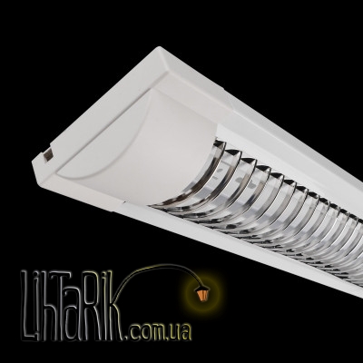 Светильник накладной, рассчитанный на одну люминесцентную линейную лампу. Его корпус изготовлен из литого алюминия и окрашен в белый цвет. Пластиковая решётка также является отражателем, она окрашена специальной краской. Чаще всего такие светильники устанавливаются на стену или потолок. Люминесцентные лампы, используемые в этих и подобных им светильниках, отличаются большой излучающей поверхностью, но как следствие, она менее яркая, чем у «точечных» источников света - ламп накаливания, галогенных ламп и т.п. Эти лампы также называют лампами дневного света, ведь их свет очень похож на дневной, он позволяет различать цвета так же точно, как и при естественном освещении. Существует множество ламп с разной цветностью, она зависит от сорта люминофора, который используется в конкретной лампе. Цвета могут варьироваться от холодных с голубоватым оттенком до тёплых, жёлтых. Кроме того, люминесцентная лампа потребляет в 4-5 раз меньше энергии, чем лампа накаливания с той же светоотдачей, да и служит она дольше (до 18 000 часов). Также её несомненным преимуществом является низкая температура колбы (до +40 градусов).
