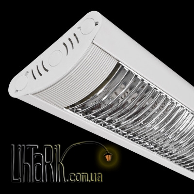 Накладной светильник белого цвета с корпусом из литого алюминия. Он рассчитан на одну люминесцентную линейную лампу. Защитная решётка изготовлена из пластика, окрашенного отражающей краской. Обычно такие светильники вешают на потолок или стену. Чаще всего их используют для освещения нежилых помещений: офисов, складов, торговых залов, различных учреждений, например больниц и аптек. Свет люминесцентной лампы не такой яркий как свет ламп накаливания или, тем более, галогенных ламп. Но это компенсируется за счёт большей излучающей поверхности. Спектр света люминесцентных ламп очень похож на дневной свет, что позволяет точно различать цвета. При работе люминесцентные лампы не нагреваются. Также несомненным преимуществом является возможность выбора оттенка лампы. Он зависит от сорта люминофоров, которые используются в конкретной лампе. Оттенки бывают разные: от холодного голубовато-белого до тёплого ярко-жёлтого. Люминесцентные лампы являются более экономной альтернативой лампам накаливания, так как расходуют в 4-5 раз меньше электроэнергии. Срок службы люминесцентных ламп составляет до 18 000 часов.