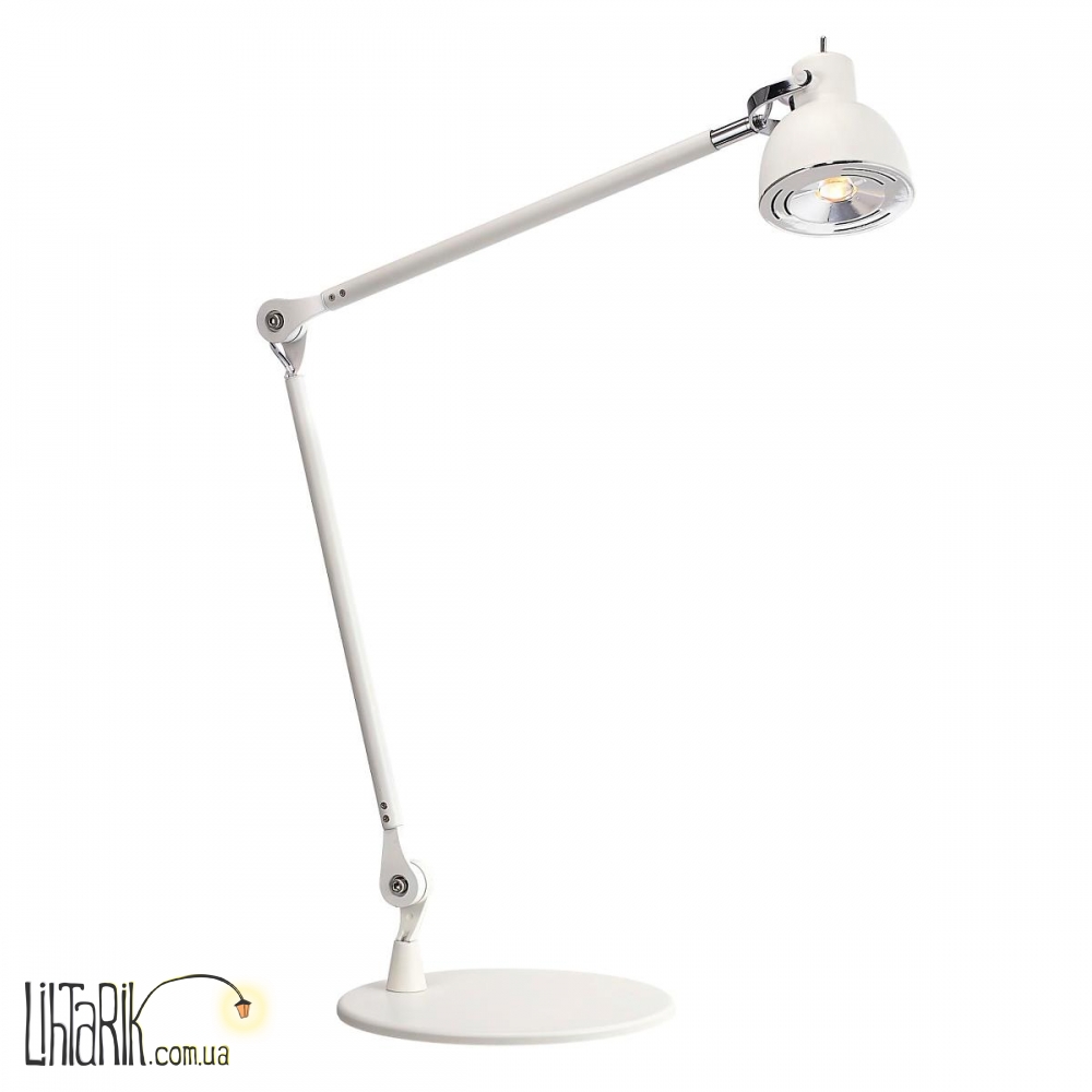 Этот настольный светильник конусообразной формы впишется в любую дизайнерскую среду. Модель представлена в белых тонах. Светильник изготовлен из металла высокого качества