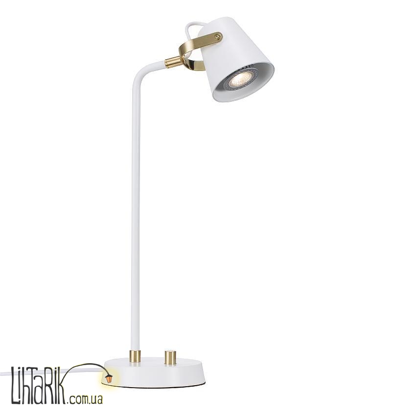Этот настольный светильник конусообразной формы впишется в любую дизайнерскую среду. Модель представлена в белых тонах.