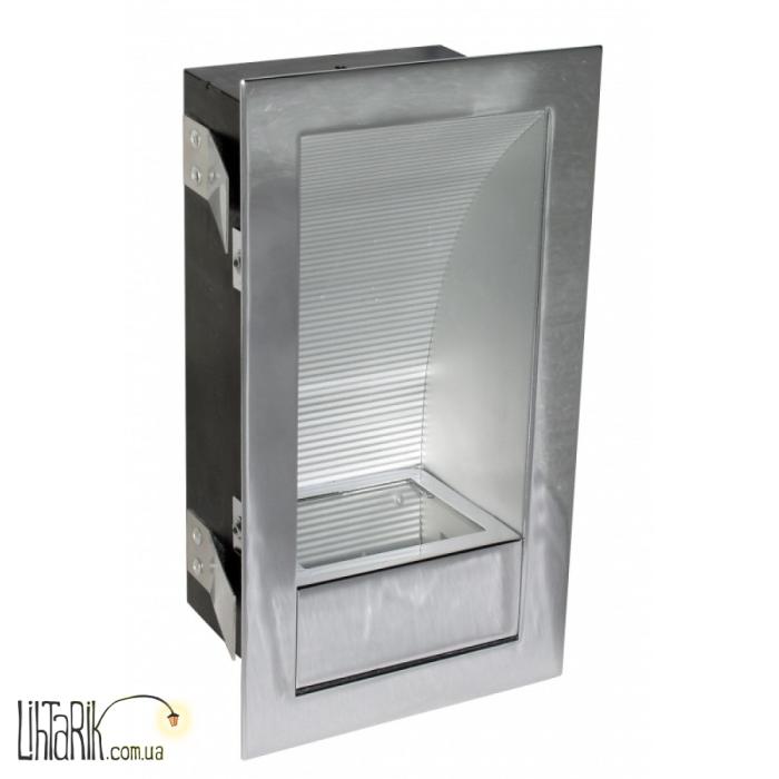Встраиваемый светильник с корпусом из листовой стали. Его видимая часть покрыта хромом в декоративных целях. Обычно такие светильники монтируются в стену и являются декоративным дополнительным источником света. Большой рефлектор значительно усиливает светосилу лампы. В качестве источника света в этом светильнике используется галогенная капсульная лапа. Такие лампочки считаются экономными, так как при одном и том же потреблении энергии, галогенная лампа имеет большую светоотдачу, чем лампа накаливания. Кроме того, срок службы галогенной лампы больше. Немаловажно также, что в свете галогенных ламп окружающие предметы кажутся ярче и контрастней.