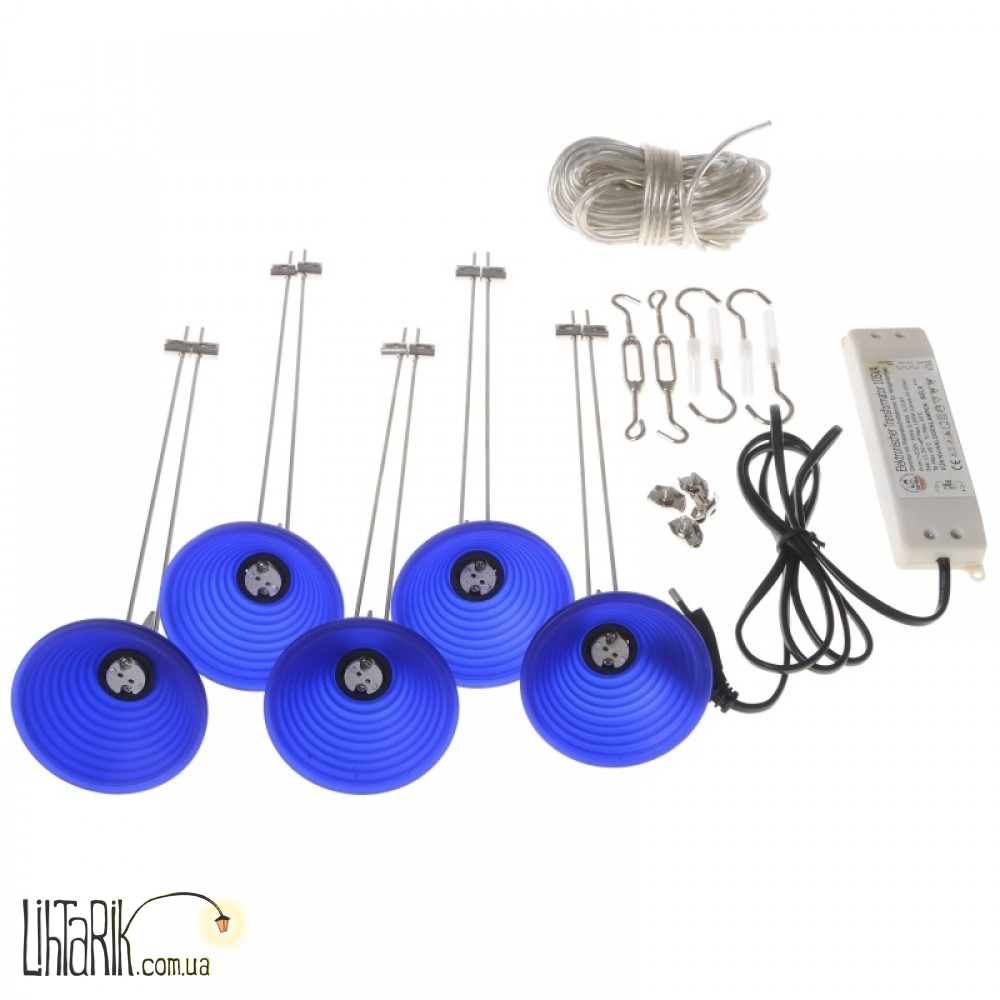 Струнная система галогенных светильников, которая состоит из пяти светильников на длинных креплениях. Их плафоны конической формы, изготовлены из синего матового стекла. Они удерживаются на особых металлических тросах (струнах) при помощи специальных креплений. Сами же плафоны крепятся на специальных шарнирах, что позволяет им вращаться в одной плоскости. Таким образом можно сфокусировать свет от нескольких светильников на каком-либо предмете, чтобы сделать акцент на нём, либо просто осветить определённую точку. Или наоборот - направить свет в разные стороны, чтобы осветить большую площадь. В комплект системы также входят 5 галогенных капсульных ламп. От обычных лампочек галогенная отличается тем, что её баллон заполнен особым газом, который позволяет достигать более высокой температуры спирали без дополнительных расходов энергии. Вследствие этого, лампа будет светить заметно ярче. Также галогенные лампы считаются более долговечными. Кроме того, они позволяют достигать более высокого качества освещения: предметы в их свете кажутся более насыщенными и контрастными. В комплект также входят струны, трансформатор и 5-метровый кабель.
