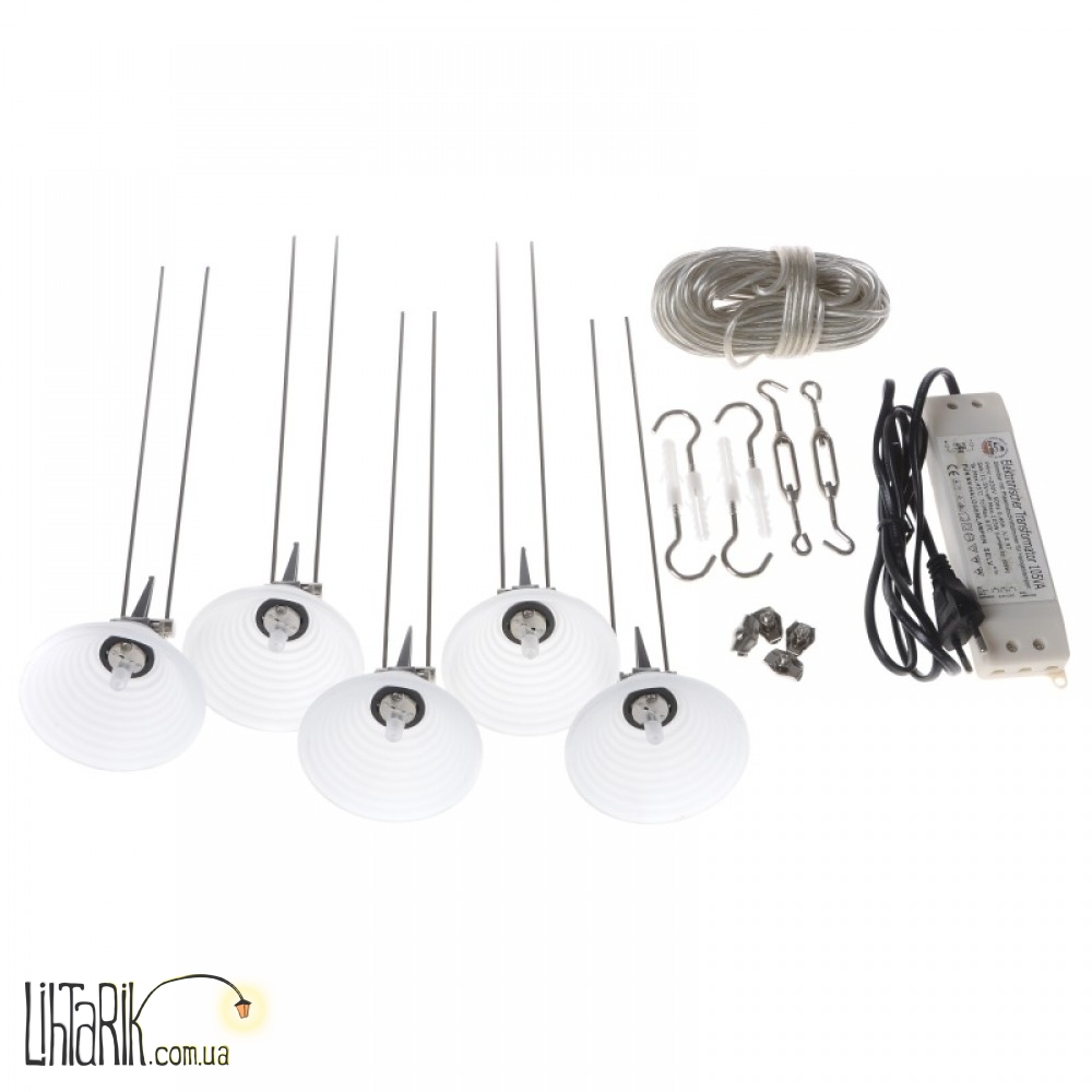 Система струнных светильников, с длинными креплениями. Их плафоны белые, конической формы, выполнены из матового стекла. Эти светильники удерживаются на металлических тросах (струнах) при помощи специальных креплений. Плафоны прикреплены на шарнирах, которые позволяют вращать их в одной плоскости примерно на 90 градусов. Таким образом можно «выделить» освещением определённый предмет или просто точку в пространстве. А можно наоборот - рассеять свет по максимальной площади. В комплекте со светильниками поставляются галогенные капсульные лампы. В отличие от обычных ламп накаливания, в их баллон добавляют буферные газы - пары галогенов, которые обеспечивают более высокую температуру спирали без дополнительных затрат энергии. Также это продляет «жизнь» лампе - она прослужит вам дольше. Кроме этого, галогенные лампы являются более качественным источником освещения, цвета предметов, освещённых ими, кажутся более яркими, насыщенными. В комплект входит трансформатор, струны и пятиметровый кабель.