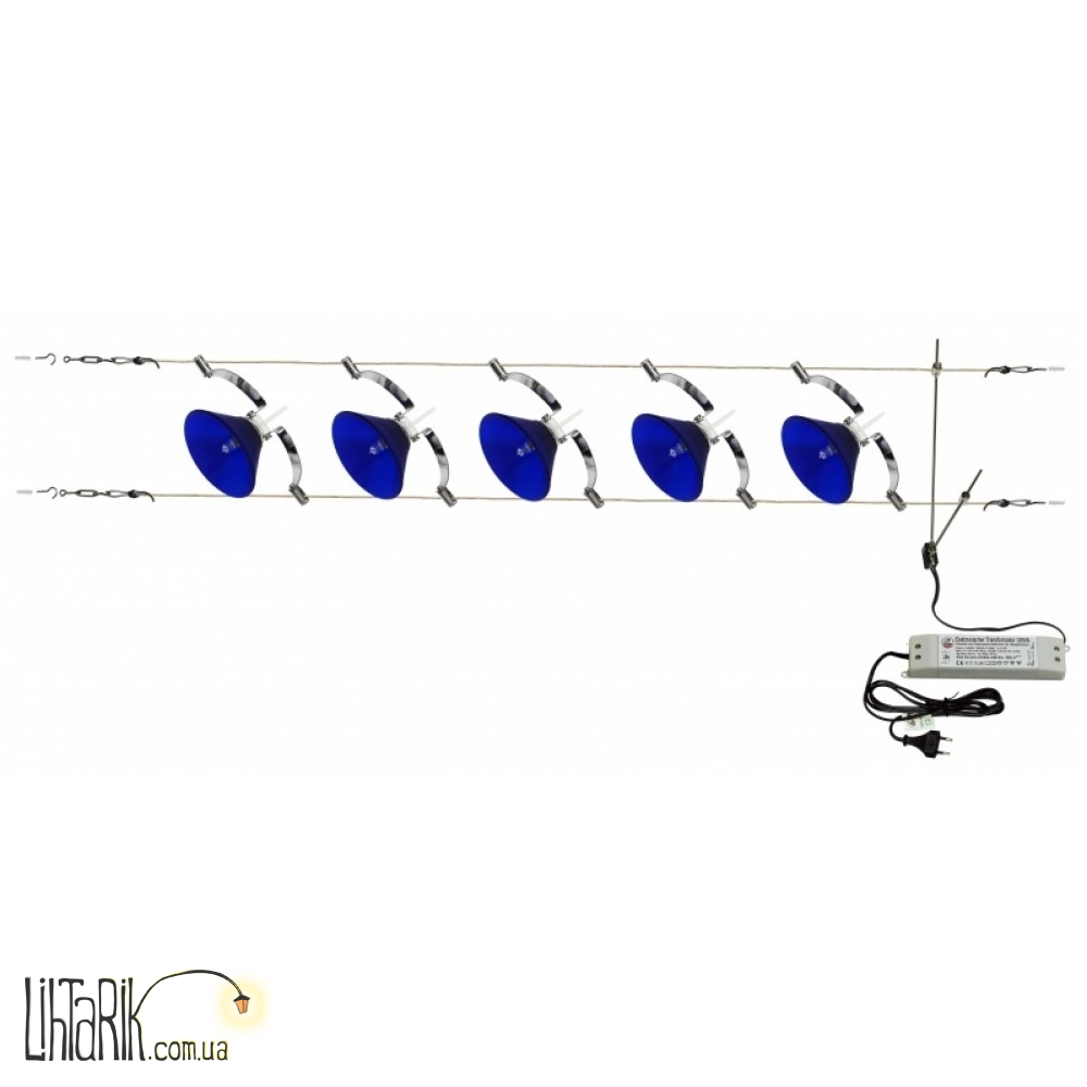 Система струнных светильников, состоящая из пяти светильников синего цвета с плафонами конической формы, изготовленными из матового стекла. Светильники удерживаются на струнах (специальных металлических струнах) при помощи специальных креплений. Сами же плафоны крепятся на специальных шарнирах, что позволяет им вращаться в одной плоскости. Таким образом можно сфокусировать свет от нескольких светильников на каком-либо предмете, чтобы сделать акцент на нём, либо просто осветить определённую точку. Или наоборот - направить свет в разные стороны, чтобы осветить большую площадь. В комплект системы также входят 5 галогенных капсульных ламп. От обычных лампочек галогенная отличается тем, что её баллон заполнен особым газом, который позволяет достигать более высокой температуры спирали без дополнительных расходов энергии. Вследствие этого, лампа будет светить заметно ярче. Также галогенные лампы считаются более долговечными. Кроме того, они позволяют достигать более высокого качества освещения: предметы в их свете кажутся более насыщенными и контрастными. В комплект также входят струны, трансформатор и 5-метровый кабель.