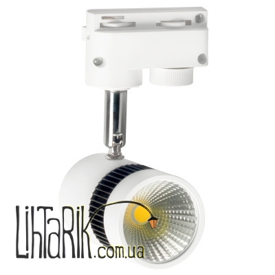 Светодиодный трековый светильник светит ярко, без мерцаний, теней, ультрафиолета и инфракрасных лучей. Его задача – освещать торговые и выставочные центры, музеи, картинные галереи и т.п. Светильник изготовлен из металла и стекла, окрашен в белый цвет с вкраплениями черного. Оборудован он поворотным механизмом, с помощью которого можно изменять угол наклона светильника, а, соответственно, и площадь освещения. Источником света выступает один мощный светодиод типа Сов (chip on board – чип на плате), который обладает большой плотностью излучения, то есть излучает больше света при меньшей площади самого светильника. Светильник со светодиодом типа Cob распределяет свет более равномерно, что позволяет частично избежать нежелательных теней. Светодиод излучает теплый белый свет. Работает от сети 220 В.