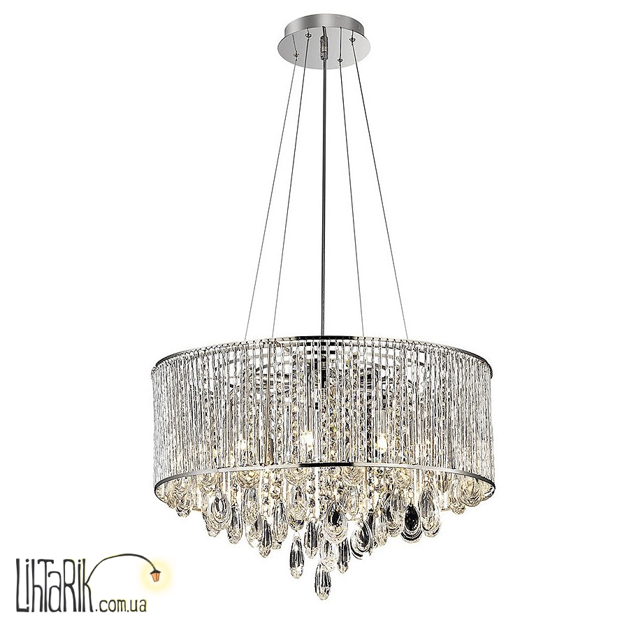Подвесной светильник бочковидного вида, с хрустальными подвесами впишется в любую дизайнерскую среду. Модель представлена в хромированных тонах. Светильник изготовлен из металла, стекла высокого качества