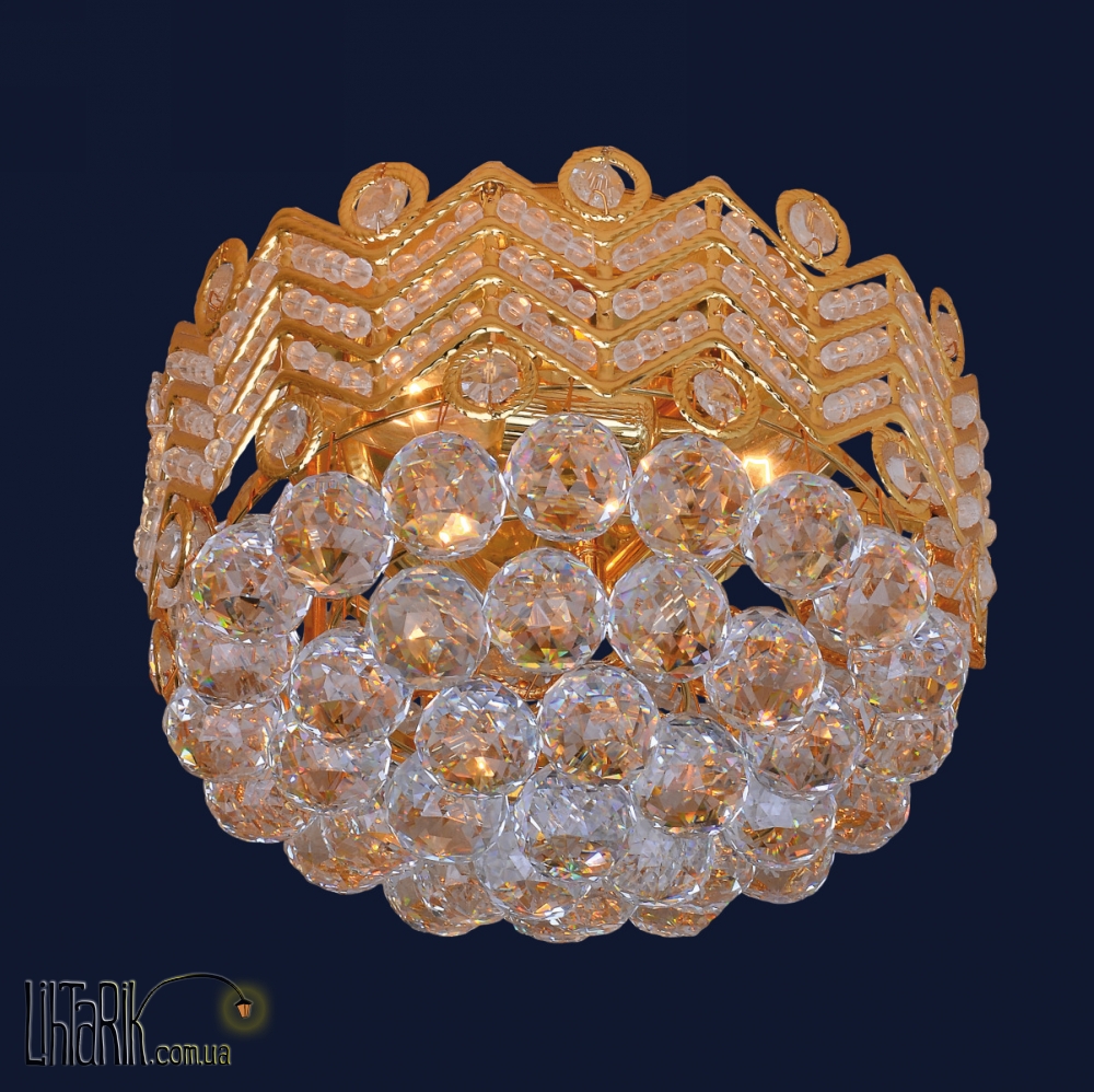 Припотолочная люстра круглого (шарообразного) вида, с хрустальными подвесами впишется в любую дизайнерскую среду. Подходит для вашей гостиной, прихожей, спальни. Модель представлена в золотых тонах. Светильник изготовлен из металла, стекла, хрусталя высокого качества