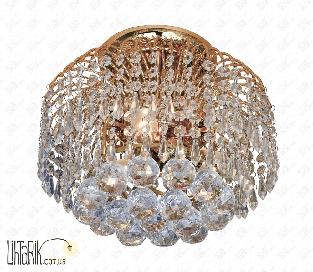 Припотолочная люстра круглого (шарообразного) вида, с хрустальными подвесами впишется в любую дизайнерскую среду. Подходит для вашей гостиной, прихожей, спальни. Модель представлена в золотых тонах. Светильник изготовлен из металла, стекла, хрусталя высокого качества