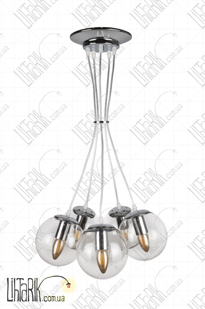 Подвесной светильник круглого (шарообразного) вида впишется в любую дизайнерскую среду. Подходит для вашей гостиной, кухни, прихожей. Модель представлена в прозрачных, хромированных тонах. Светильник изготовлен из металла, стекла высокого качества
