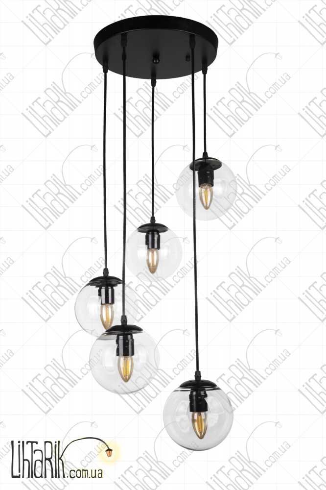 Светильник подвесной круглого (шарообразного) вида впишется в любую дизайнерскую среду. Подходит для вашей гостиной, кухни, прихожей. Модель представлена в прозрачных, черных тонах. Светильник изготовлен из металла, стекла высокого качества