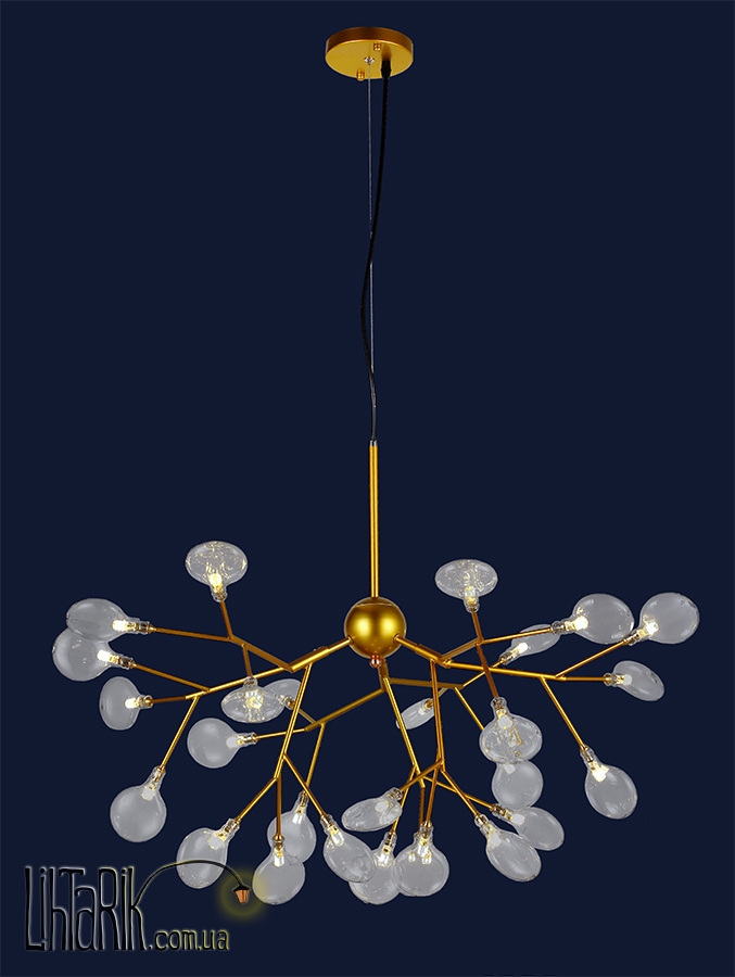 Подвесной светильник оригинальной формы впишется в любую дизайнерскую среду. Подходит для вашей гостиной. Модель представлена в золотых, прозрачных тонах. Светильник изготовлен из металла высокого качества