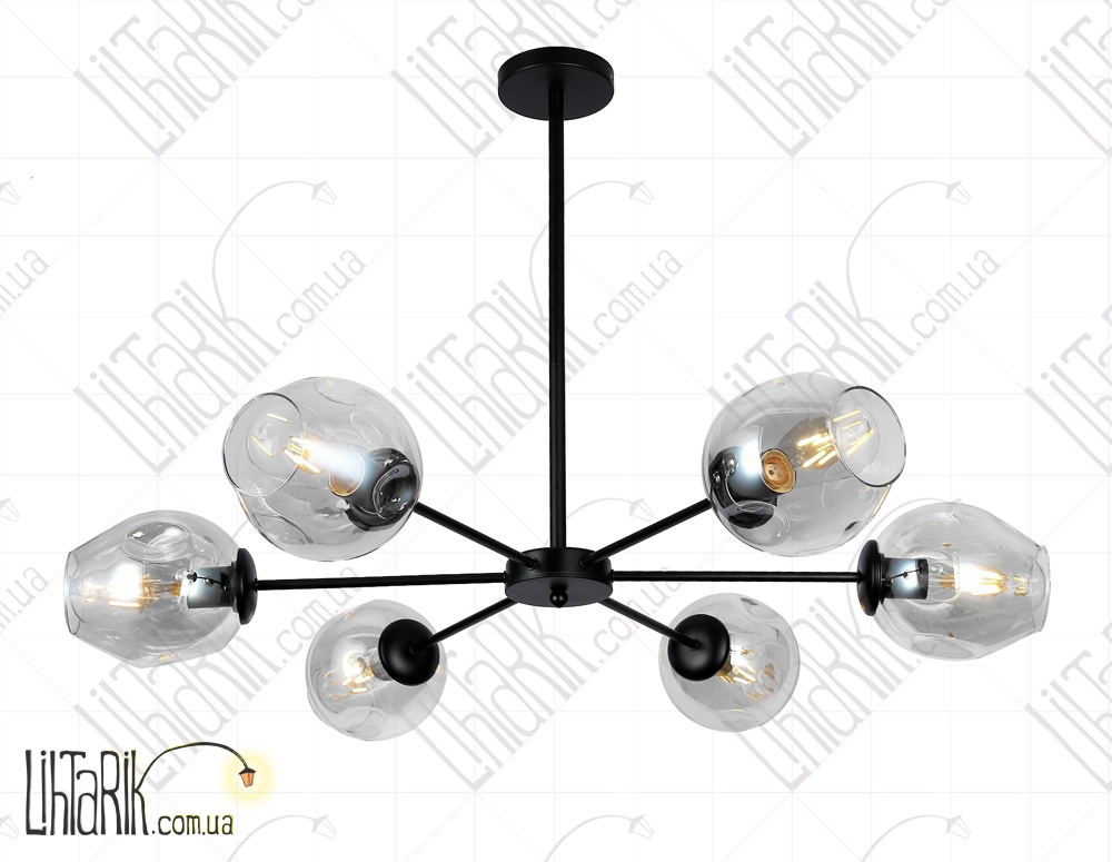Светильник подвесной круглого (шарообразного) вида впишется в любую дизайнерскую среду. Подходит для вашей гостиной, кухни, спальни. Модель представлена в прозрачных, черных тонах. Светильник изготовлен из металла, стекла высокого качества