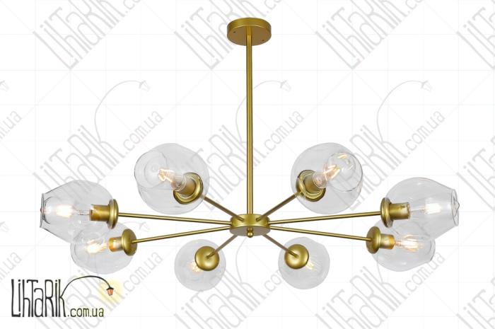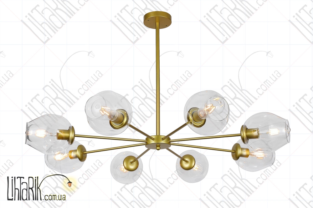 Светильник подвесной круглого (шарообразного) вида впишется в любую дизайнерскую среду. Подходит для вашей гостиной, кухни, спальни. Модель представлена в золотых, прозрачных тонах. Светильник изготовлен из металла, стекла высокого качества