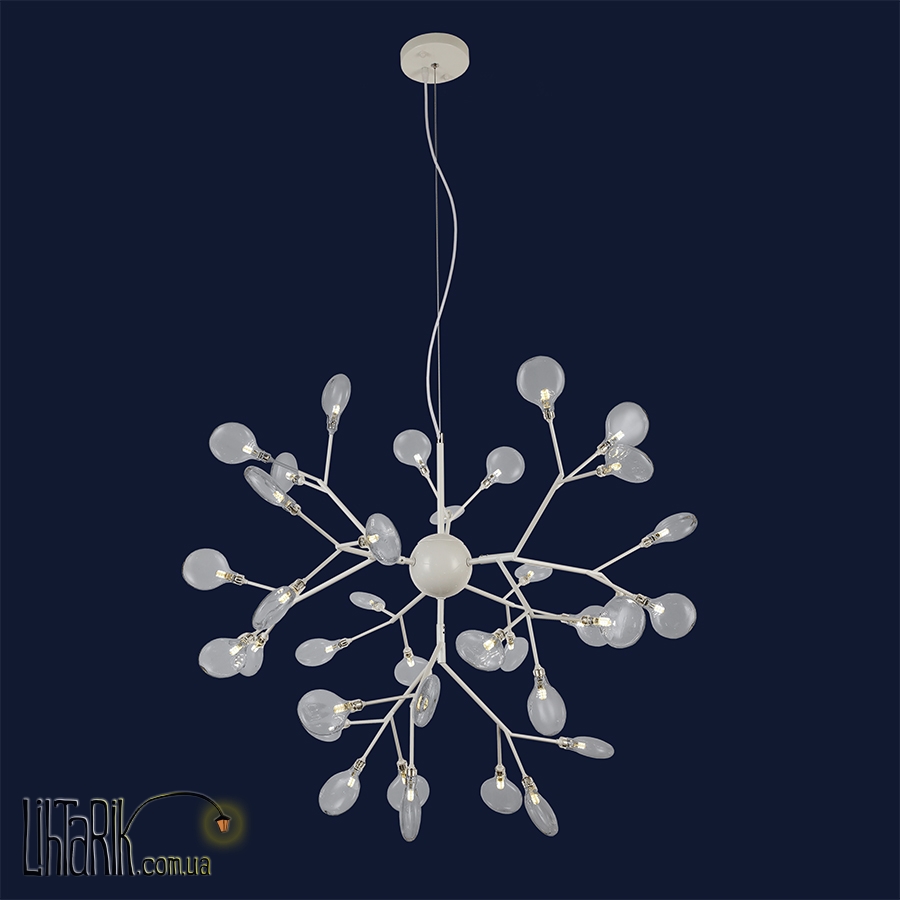 Подвесной светильник оригинальной формы впишется в любую дизайнерскую среду. Подходит для вашей гостиной, спальни. Модель представлена в белых, прозрачных тонах. Светильник изготовлен из металла, стекла высокого качества