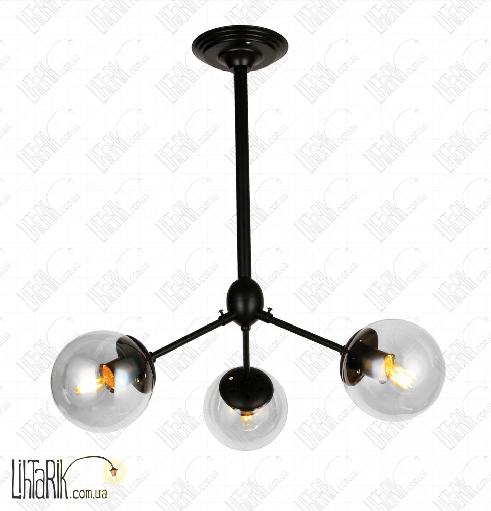 Светильник подвесной, Светильник на потолок круглого (шарообразного) вида впишется в любую дизайнерскую среду. Подходит для вашей гостиной, кухни, прихожей. Модель представлена в прозрачных, черных тонах. Светильник изготовлен из металла, стекла высокого качества