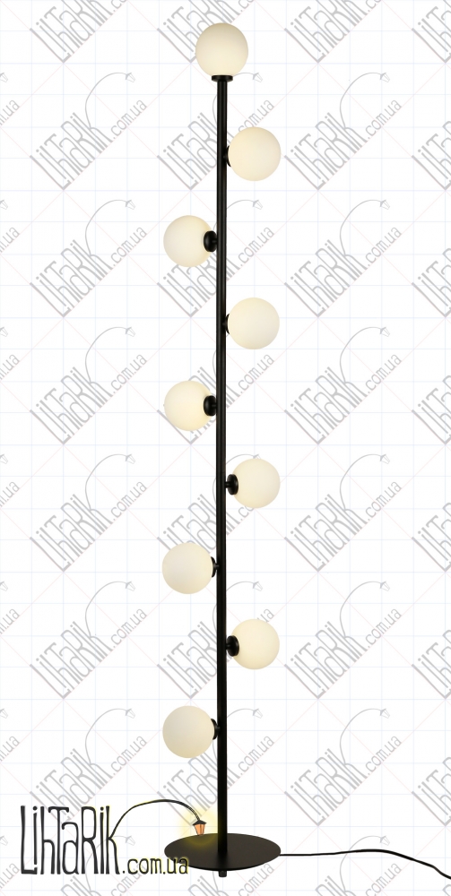 Оригинальный торшер круглого (шарообразного) вида впишется в любую дизайнерскую среду. Подходит для вашей гостиной, спальни. Модель представлена в черных тонах. Светильник изготовлен из металла, стекла высокого качества