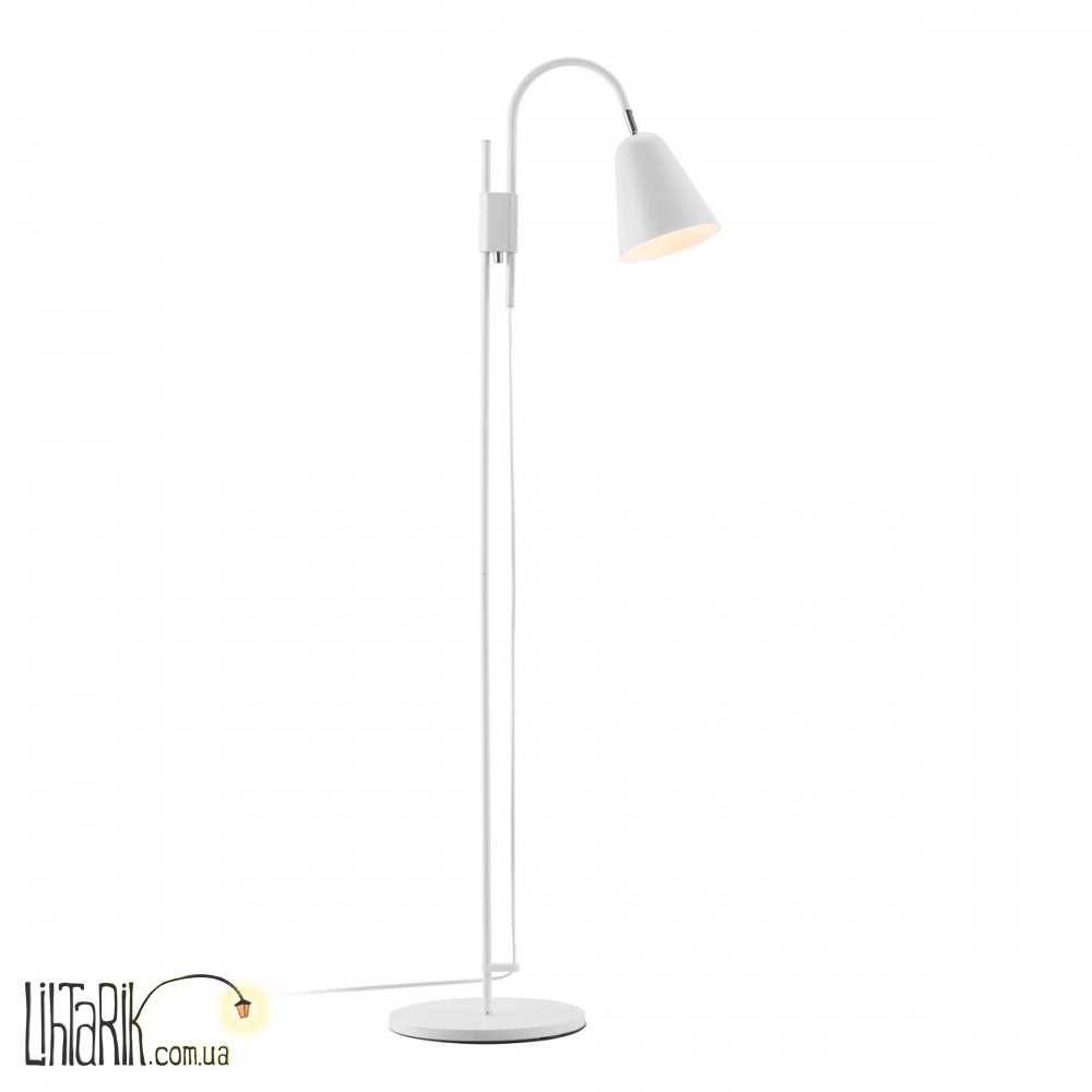 Оригинальный торшер с оригинальным абажуром, конусообразной формы впишется в любую дизайнерскую среду. Модель представлена в белых тонах.