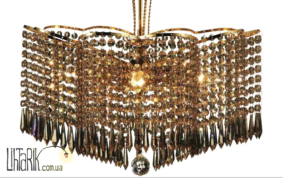 Подвесной светильник с хрустальными подвесами впишется в любую дизайнерскую среду. Подходит для вашей гостиной. Модель представлена в золотых тонах. Светильник изготовлен из металла, хрусталя высокого качества