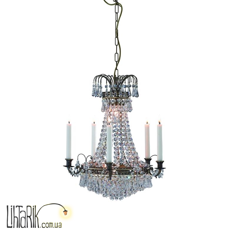 Подвесной светильник в виде свечей, с хрустальными подвесами впишется в любую дизайнерскую среду. Подходит для вашей гостиной. Модель представлена в бронзовых, прозрачных тонах. Светильник изготовлен из металла, хрусталя высокого качества