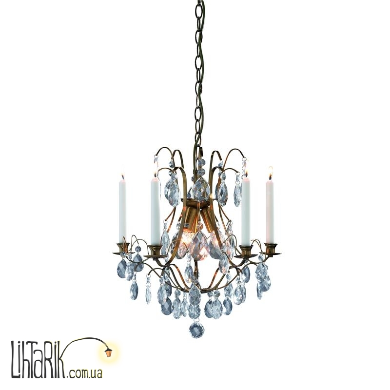 Подвесной светильник в виде свечей, с хрустальными подвесами впишется в любую дизайнерскую среду. Подходит для вашей гостиной. Модель представлена в бронзовых, прозрачных тонах. Светильник изготовлен из металла, хрусталя высокого качества