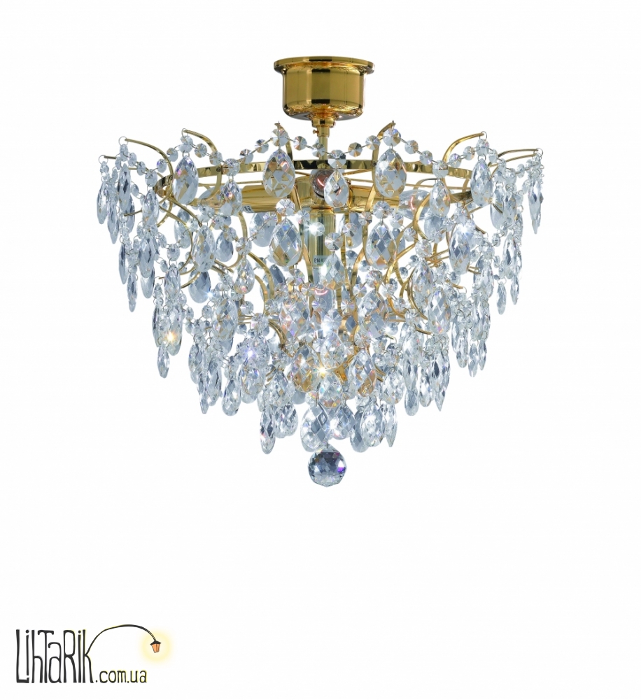 Припотолочная люстра с хрустальными подвесами впишется в любую дизайнерскую среду. Модель представлена в золотых, прозрачных тонах. Светильник изготовлен из металла, хрусталя высокого качества