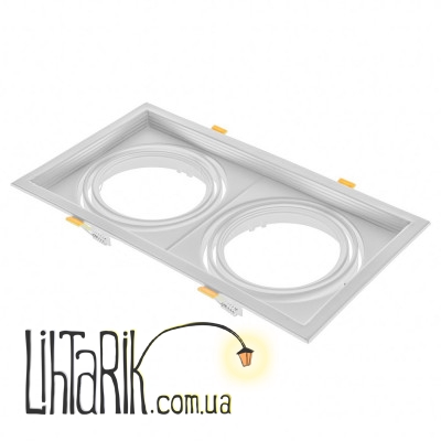 Поворотный светильник с белой передней панелью, металлический. Состоит из двух отдельных источников света - галогенных рефлекторных или светодиодных ламп с цоколем G53. Направление источников света можно регулировать. Это нужно для того, чтобы освещать комнату по частям, а не целиком или наоборот, чтобы рассеять свет наиболее равномерно. Такого рода светильники можно монтировать как в горизонтальную, так и вертикальную поверхность, тыльная сторона оборудована «лапками», которые обеспечивают надежное крепление светильника в специальном отверстии.