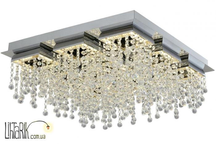 Припотолочная люстра с четкими ровными углами, с хрустальными подвесами впишется в любую дизайнерскую среду. Модель представлена в хромированных тонах. Светильник изготовлен из металла высокого качества