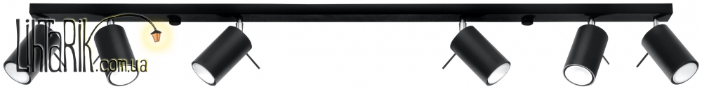 Патрон: GU10, 6 x max. 40W, 50 Hz, 220V, IP20. Лампы не в комплекте. Размеры: 117 x 6 x 16 cm Материал: металл Цвет: чёрный