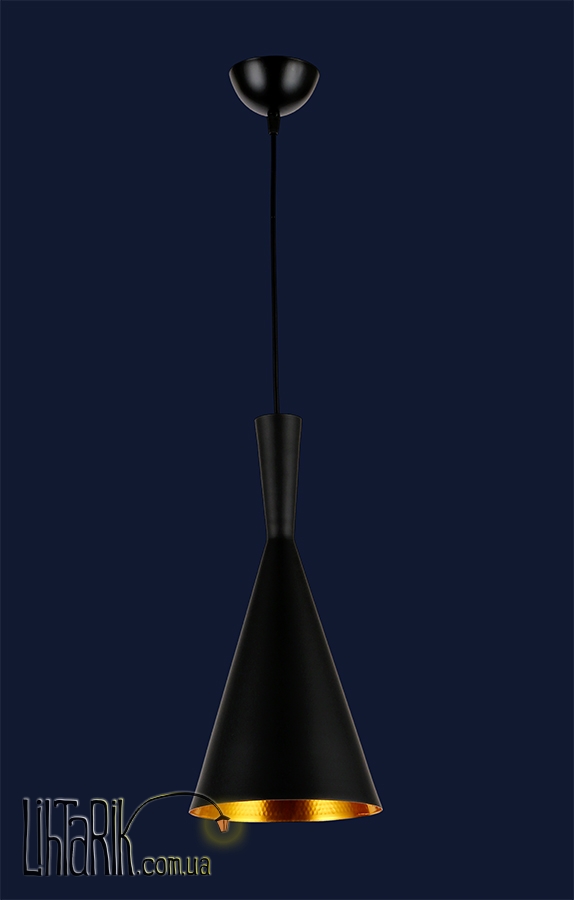 Светильник подвесной конусообразной формы впишется в любую дизайнерскую среду. Подходит для вашей кухни, прихожей. Модель представлена в золотых, черных тонах. Светильник изготовлен из металла высокого качества