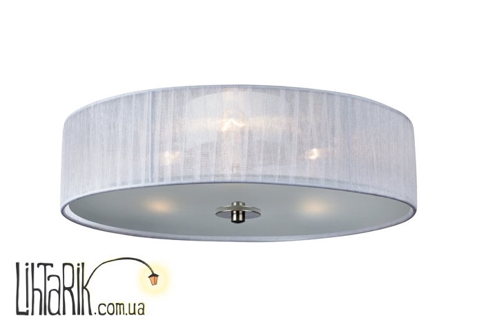 Припотолочная люстра бочковидного вида впишется в любую дизайнерскую среду. Модель представлена в белых тонах. Светильник изготовлен из металла, стекла, ткани высокого качества