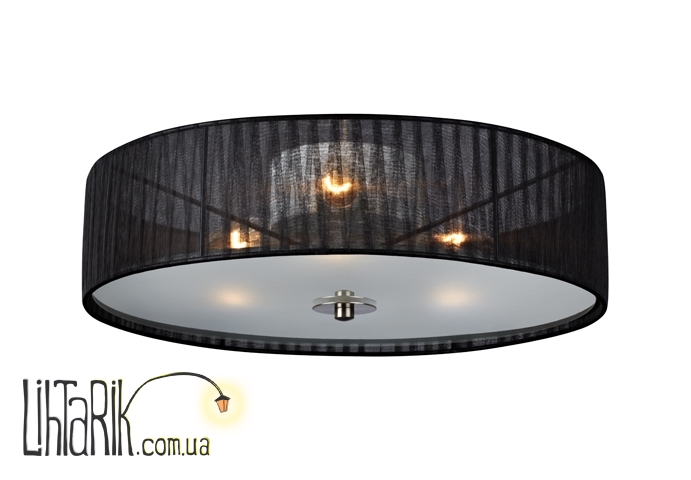 Припотолочная люстра бочковидного вида впишется в любую дизайнерскую среду. Модель представлена в черных тонах. Светильник изготовлен из металла, стекла, ткани высокого качества