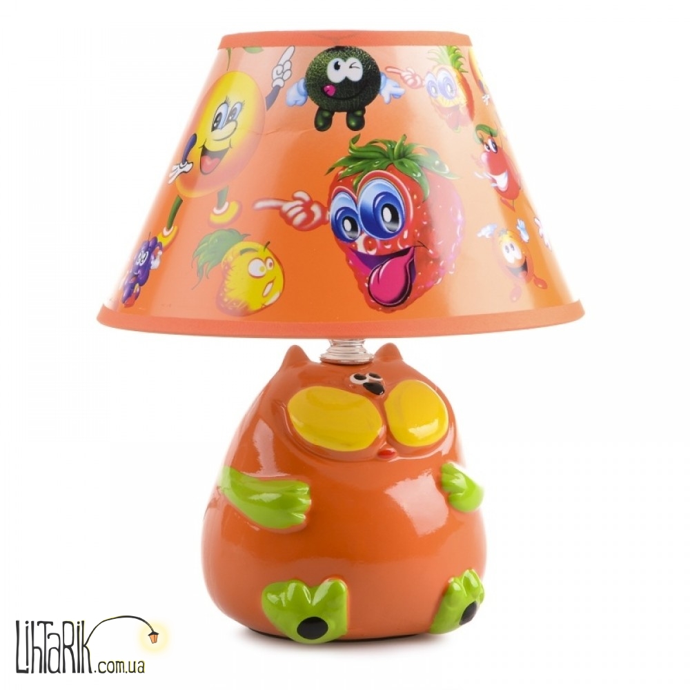 Представляем вашему вниманию новинку от ТМ Brille – настольную лампу для детской комнаты TP-018 E14 OR. Лампа яркая, красочная, компактная, ее можно поставить как на тумбочку возле кровати, так и на письменный стол. Если разместить настольную лампу возле кровати, в таком случае она будет играть роль ночника. Материалами для изготовления осветительного прибора послужили керамика и картон. Его конструкция состоит из керамического основания, выполненного в форме забавного кота и одного картонного плафона-абажура формы срезанного конуса. Кот окрашен в оранжевый цвет, лапы у него зеленые, а щеки желтые. Кот чем-то напоминает кота из советского мультфильма «Возвращение блудного попугая», такой же пышный и довольный. С основанием разобрались, что касается плафона, то он украшен изображениями фруктов. Тут и виноград, и груша, и клубника, и яблоко, и лимон. Только вот фрукты, не простые, а с ногами, руками и глазами. Намудрили мастера с дизайном. Для работы настольной лампы необходимо использовать одну лампочку с цоколем Е14 мощностью 40 Вт. Мягкий, приятный для восприятия свет настольной лампы сделает пребывание вашего ребенка в своей спальне максимально комфортным.