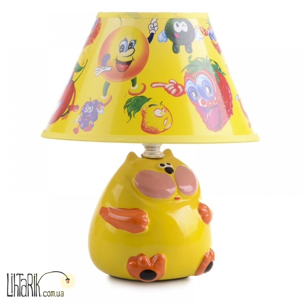 Представляем вашему вниманию новинку от ТМ Brille – настольную лампу для детской комнаты TP-018 E14 YL. Лампа яркая, красочная, компактная, ее можно поставить как на тумбочку возле кровати, так и на письменный стол. Если разместить настольную лампу возле кровати, в таком случае она будет играть роль ночника. Материалами для изготовления осветительного прибора послужили керамика и картон. Его конструкция состоит из керамического основания, выполненного в форме забавного кота и одного картонного плафона-абажура формы срезанного конуса. Кот окрашен в желтый цвет, лапы у него оранжевые, а щеки розовые. Кот чем-то напоминает кота из советского мультфильма «Возвращение блудного попугая», такой же пышный и довольный. С основанием разобрались, что касается плафона, то он украшен изображениями фруктов. Тут и виноград, и груша, и клубника, и яблоко, и лимон. Только вот фрукты, не простые, а с ногами, руками и глазами. Намудрили мастера с дизайном. Для работы настольной лампы необходимо использовать одну лампочку с цоколем Е14 мощностью 40 Вт. Выключатель находится на шнуре. Мягкий, приятный для восприятия свет настольной лампы сделает пребывание вашего ребенка в своей спальне максимально комфортным.