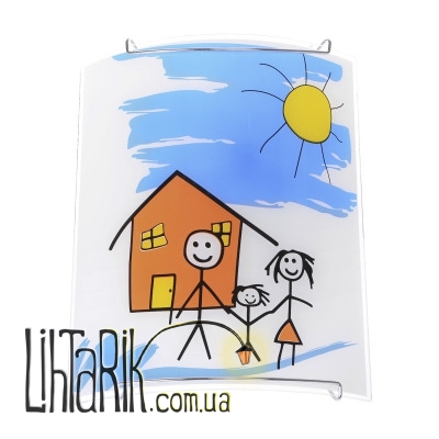 W-479/1 – теплый настенный светильник. Теплый, не только из-за мягкого освещения. Теплый, потому что на его плафоне изображено солнце, дом и счастливая семья. Глядя на такой светильник, хочется поскорее повесить его в детской и включить. Светильник изготовлен из металла и стекла. Плафон стеклянный, матовый, прямоугольной формы. Для работы необходимо использовать одну лампочку с цоколем Е27. Одинаково хорошо подойдет как лампа накаливания, так и энергосберегающая или светодиодная. Включать и выключать светильник необходимо с помощью настенного клавишного выключателя.